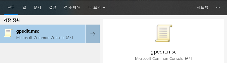 윈도우창에 gpedit.msc 를 검색하여 실행합니다.