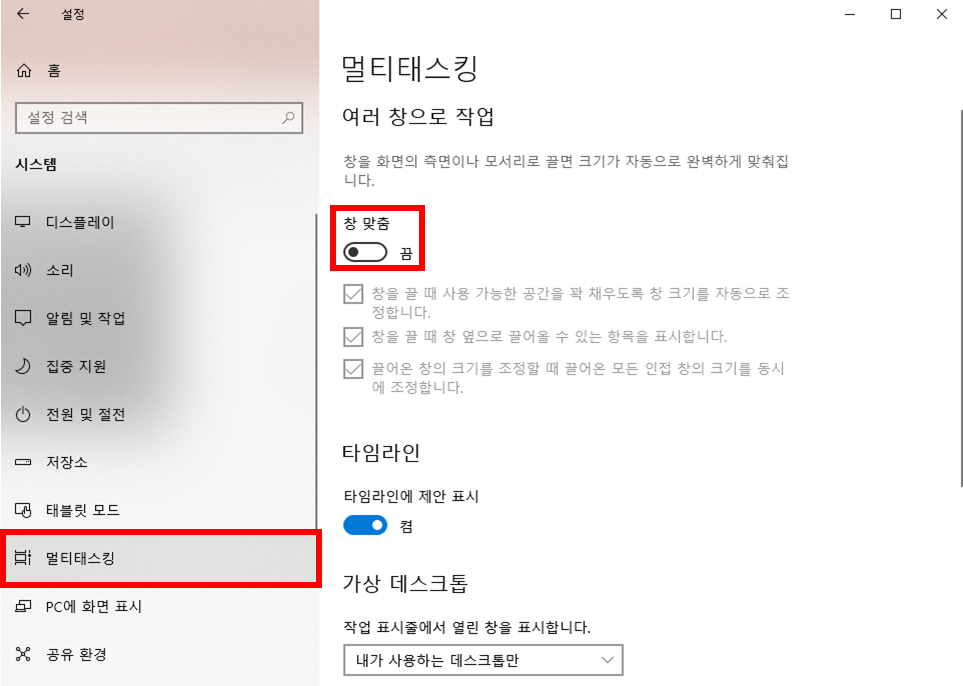 멀티태스킹 탭으로 가서 창 맞춤을 끕니다.
