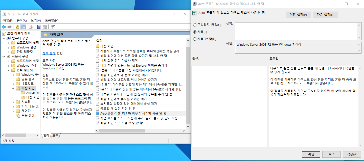사용자구성 - 관리 템플릿 - 바탕화면 의 Aero 흔들기 창 최소화 마우스 제스처 사용 안 함 더블클릭 후 사용 체크 후 확인