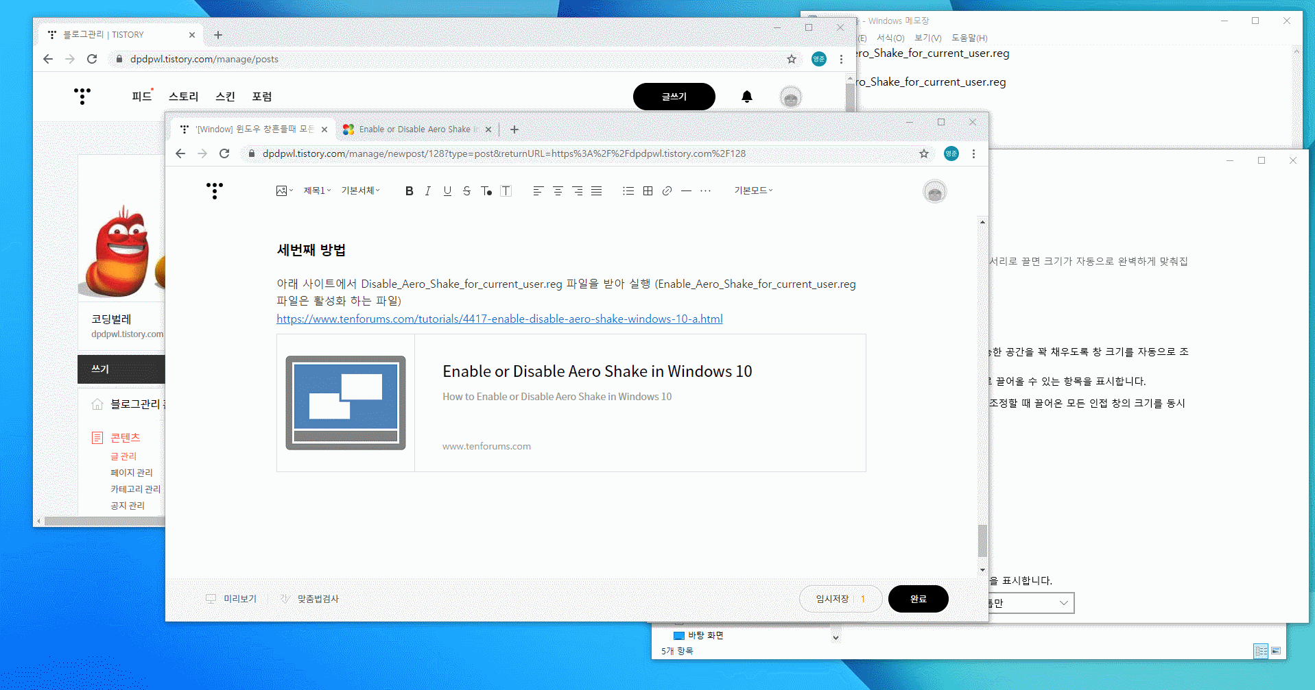 이번에는 윈도우 창을잡고 흔들면 모든창이 최소화되는 기능을 끄는 방법에대해 알아보겠습니다.
