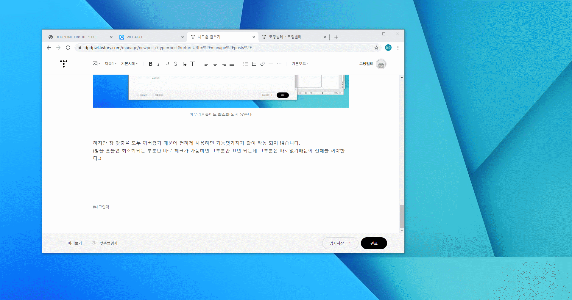 하지만 창 맞춤을 모두 꺼버렸기 때문에 편하게 사용하던 기능몇가지가 같이 작동 되지 않습니다.