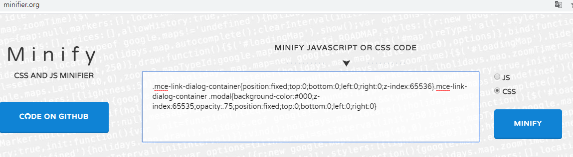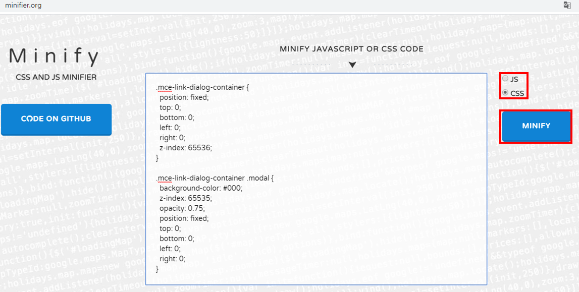코드 경량화를 시킬 언어를 선택하고 코드박스에 코드를 기입한뒤 MINIFY를 누른다